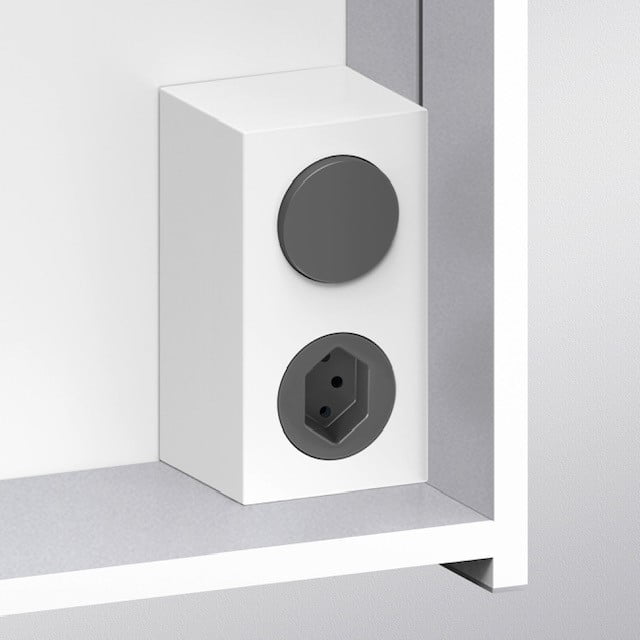 Les prises de courant se trouvent exactement là où on en a besoin - dans la partie la plus basse du compartiment dans un des coins. Ainsi, aucun câble ne pend devant vous par le haut. Dans ce compartiment, la brosse à dents électrique ou le rasoir peut être rangé. Idéal si l‘alimentation électrique est juste à côté.