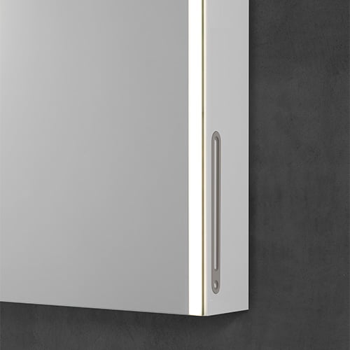 Sur le bord droit de l’armoire avec miroir éclairé se trouve un curseur qui permet de régler parfaitement la luminosité pour le maquillage. En appuyant sur le curseur, trois différentes scènes lumineuses préréglées sont disponibles (5000/4000/3000K). Vous pouvez, individuellement définir la 4ème scène lumineuse (préréglée à 2000K) avec la commande rotative et en l’enregistrant avec le curseur – rien de plus simple !